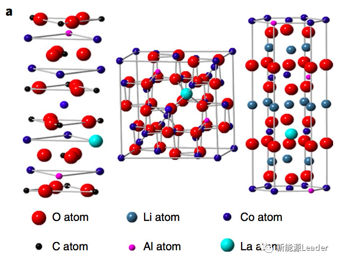 鈷酸鋰材料的理論容量為274mAh/g,但在實際使用中為了保持鈷酸鋰的結構穩(wěn)定性和良好的循環(huán)性能,我們一般將充電電壓限制在4.2V左右,因此鈷酸鋰的實際使用容量也就在140mAh/g左右,近年來材料廠家通過表面包覆合、元素摻雜等手段提升了鈷酸鋰材料的結構穩(wěn)定性,充電電壓可以提升至4.35V,從而使得鈷酸鋰材料的可逆容量達到165mAh/g左右,但是這仍然無法滿足高比能鋰離子電池的需求,為此華為中央研究院聯合美國阿貢國家實驗室通過La和Al摻雜,將LiCoO2的穩(wěn)定電壓提高到了4.5V,可逆容量達到190mAh/g,其中La能夠增加LCO材料在c軸方向上的晶胞參數,Al則能夠起到促進Li+擴散、穩(wěn)定晶體結構和防止LCO材料相變的作用,兩者相互作用顯著改善了LCO材料在高電壓下的結構穩(wěn)定性,循環(huán)50次后仍然能夠保持96%的容量,并使得LCO材料的倍率性能得到了大幅提高。