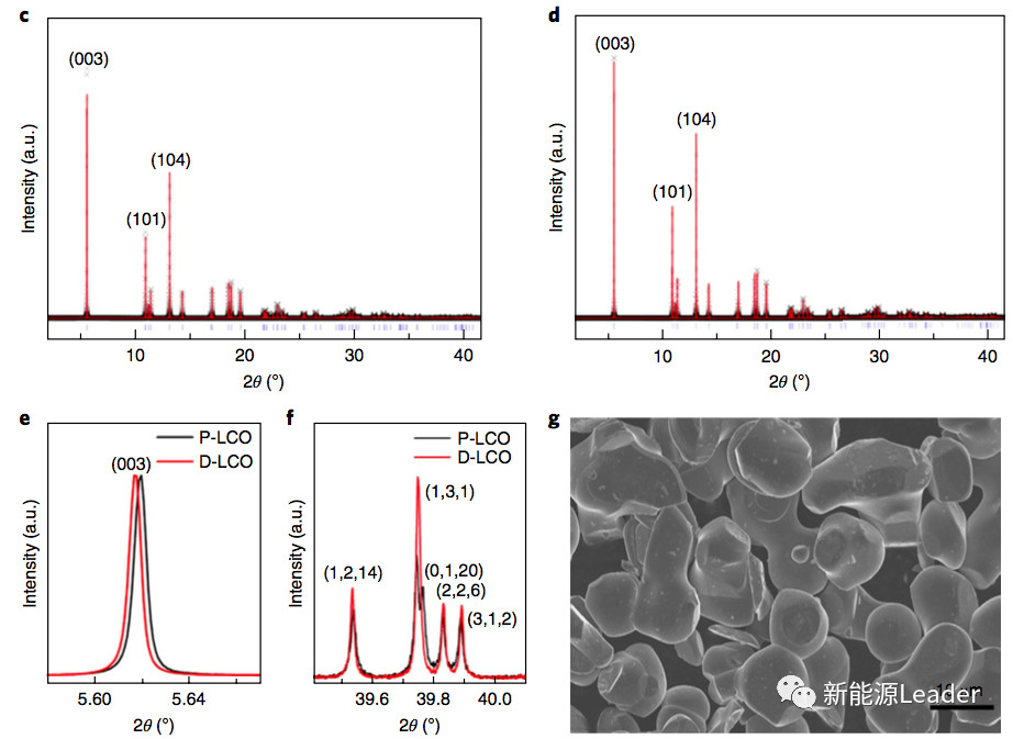 材料的dQ/dV曲線是反應材料相變的重要參考點,從沒有摻雜的LCO材料的dQ/dV曲線(上圖e)上能夠看到,材料在4.1V、4.2V和4.46V出現了三個峰值,其中4.1V、4.2V對應的為材料的有序-無序結構轉變,而在4.46V處的峰則表示材料進一步發(fā)生相變,而我們反觀經過摻雜處理的LCO材料在相同的電壓范圍內沒有出現峰值,表明La和Al摻雜很好的抑制了LCO材料的相變。