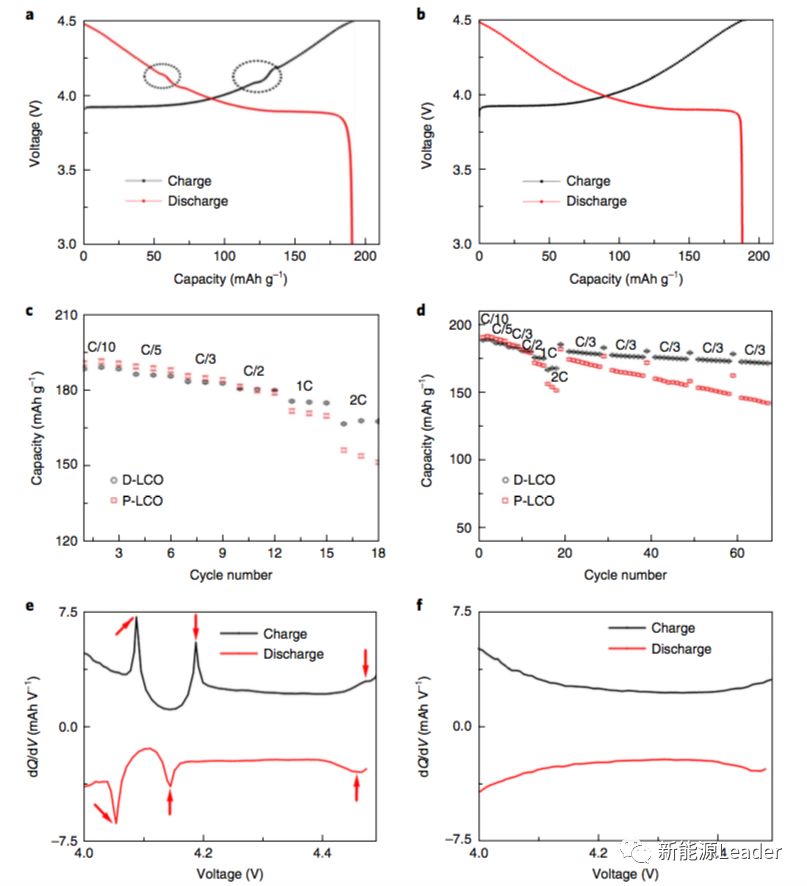 華為中央研究院和阿貢實驗室的科研人員們緊密合作,通過在LCO材料中摻入少量的La和Al很好的抑制了在脫Li過程中LCO材料發(fā)生的相變,減輕了顆粒內部和顆粒之間的應力產生和積累,從而減少了循環(huán)過程中LCO顆粒表面裂紋的產生,極大的提升了LCO材料在4.5V高電壓下的循環(huán)穩(wěn)定性,同時使得LCO材料的可逆容量達到190mAh/g,遠高于目前的高壓鈷酸鋰材料(4.35V,165mAh/g)。同時La、Al摻雜還顯著的提升了Li+在LCO材料那的擴散速度,提升了材料的倍率性能。最后,小編要說一句:“科研不是口號,喊喊就行了,科研是投入真金白銀搞出來的,向華為致敬!”