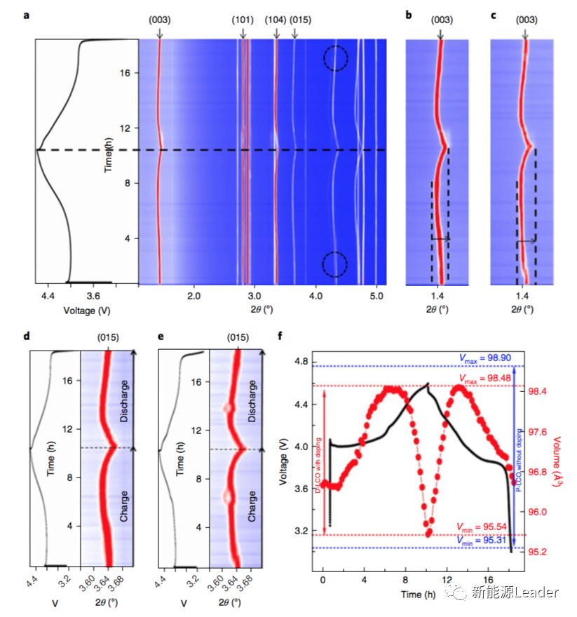 原位X涉嫌衍射分析揭示了LA、Al摻雜提高LCO材料循環(huán)性能的原因,從下圖中能夠看到摻雜后的LCO材料除了在低電壓范圍內有一個絕緣體-金屬導體的轉變外,在整個電壓范圍內都是單相固溶體結構,而沒有摻雜的LCO材料在整個電壓范圍內發(fā)生了一系列的相變反應。從下圖b和c來看在脫Li的過程中沒有摻雜的LCO材料的晶胞參數c變化明顯要好于經過摻雜的LCO材料,因此導致沒有摻雜的LCO在脫Li過程中晶胞體積膨脹達到3.63%,而經過摻雜處理的LCO僅為2.97%,這極大的減少了LCO在脫Li過程中顆粒內部和顆粒之間應力的產生,提升了LCO材料的循環(huán)性能。