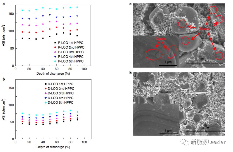 通過對LCO材料的比面電阻進行分析發(fā)現,沒有摻雜處理的LCO材料在循環(huán)過程中比面電阻上升的很快,而經過摻雜處理后的LCO材料循環(huán)過程中電極的比面電阻僅有輕微的升高,這主要是因為La、Al摻雜很好的抑制了脫Li過程中的LCO材料的相變,從而減輕了材料中的應力,避免了循環(huán)過程中LCO材料裂紋的產生。而沒有摻雜的LCO材料由于脫Li過程中LCO中存在多種相變,因此導致了LCO材料在循環(huán)過程中積累了大量的應力,從而在顆粒表面產生了許多的裂縫,從而加劇了電解液在LCO材料表面的分解,導致電阻迅速增加。