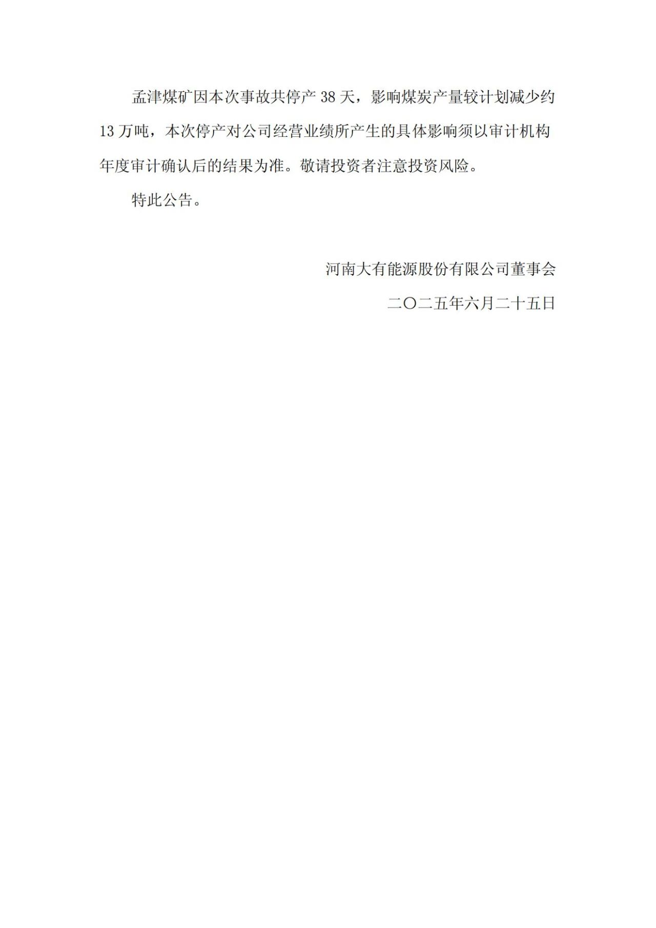 2025年5月15日,大有能源全資子公司義馬煤業(yè)集團(tuán)孟津煤礦有限責(zé)任公司(以下簡(jiǎn)稱“孟津煤礦”)因發(fā)生一起事故而停產(chǎn)。孟津煤礦因本次事故共停產(chǎn)38天,影響煤炭產(chǎn)量較計(jì)劃減少約13萬(wàn)噸。