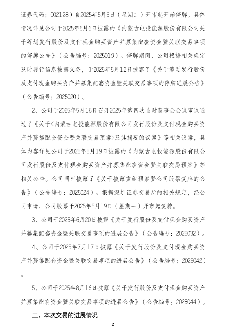 自本次交易預案披露以來,電投能源及相關各方正在積極推進本次交易的相關工作。截至本公告披露日,本次交易相關的審計、評估等工作尚未完成,電投能源將在本次交易涉及的審計、評估等事項完成后,再次召開董事會會議審議本次交易的相關議案,并由董事會提請股東大會審議本次交易相關事項,同時按照相關法律法規的規定履行后續有關審批程序及信息披露義務。