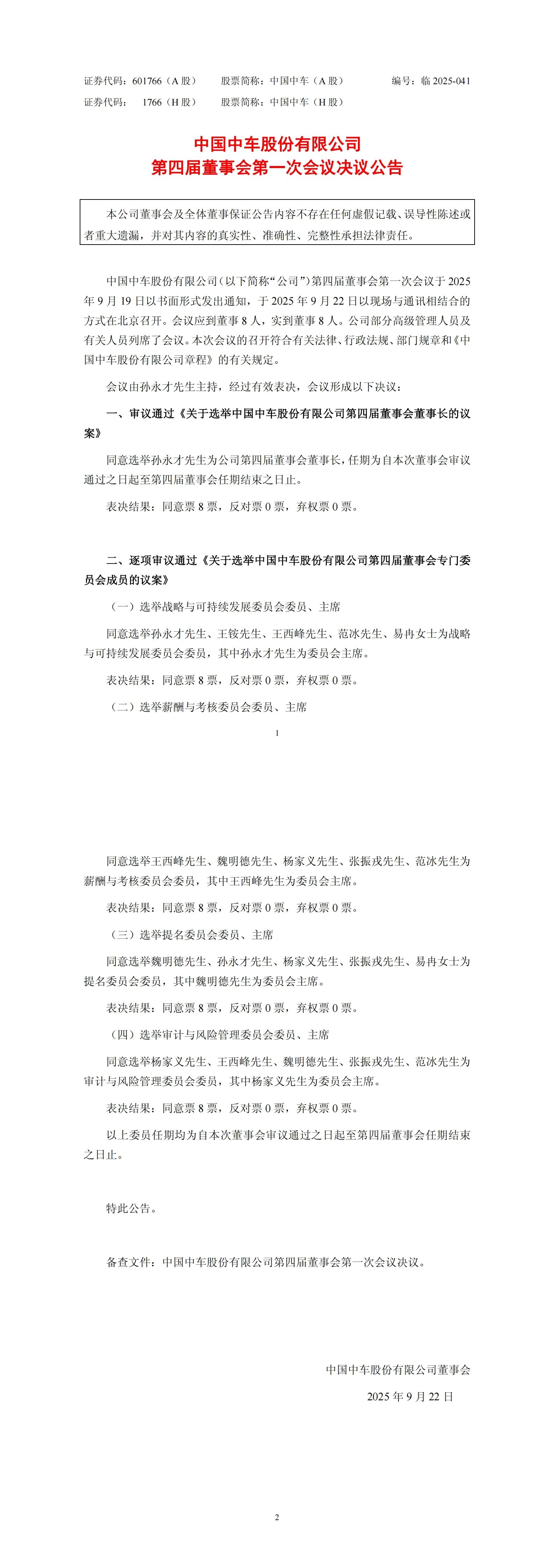 9月22日,中國中車股份有限公司第四屆董事會第一次會議在北京召開,審議通過董事長選舉議案,同意孫永才當(dāng)選公司第四屆董事會董事長,任期自本次會議審議通過之日起至第四屆董事會任期結(jié)束。