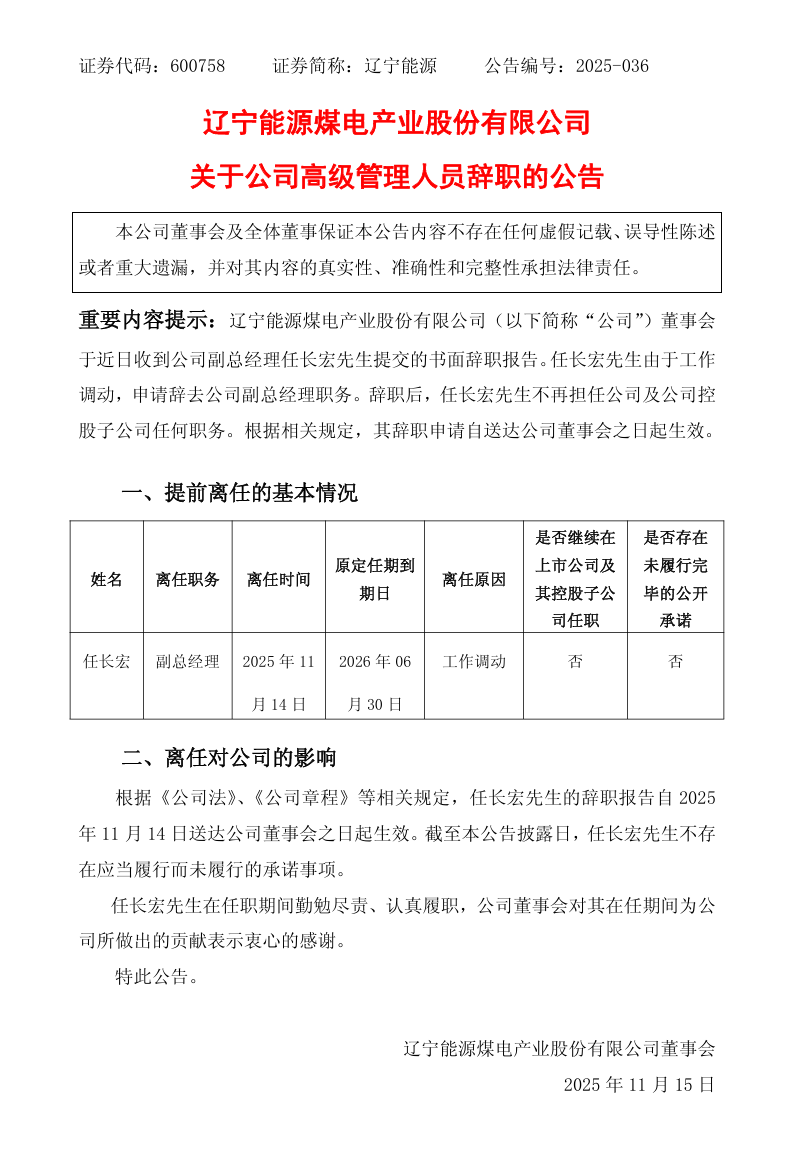 11月14日,遼寧能源發(fā)布公告稱,公司董事會于近日收到公司副總經(jīng)理任長宏先生提交的書面辭職報告。任長宏先生由于工作調(diào)動,申請辭去公司副總經(jīng)理職務(wù)。辭職后,任長宏先生不再擔(dān)任公司及公司控股子公司任何職務(wù)。