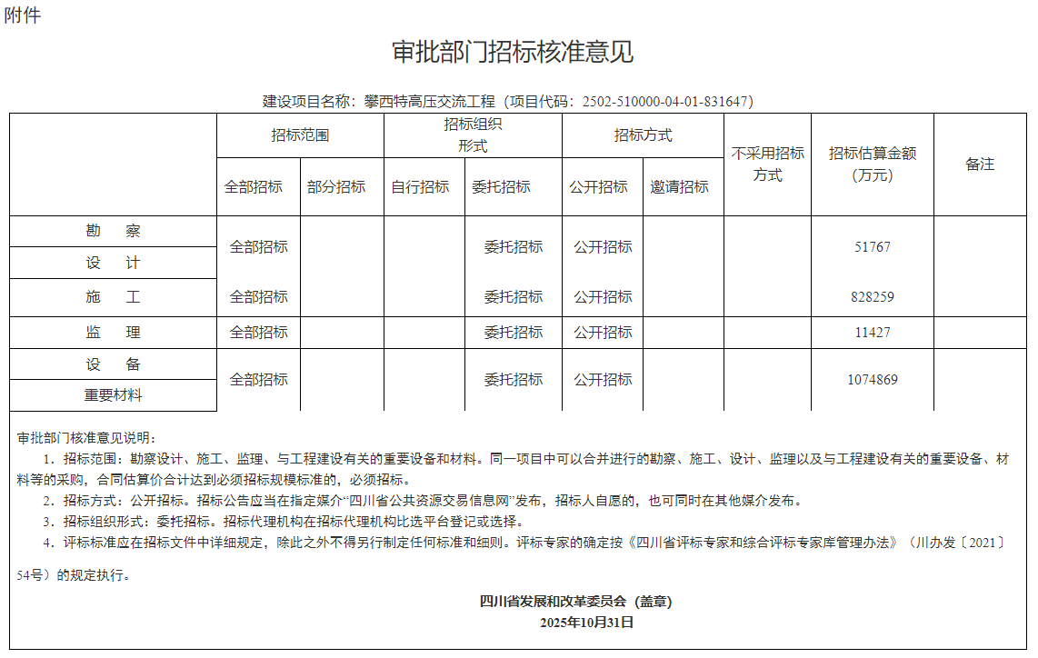 報(bào)來(lái)《關(guān)于呈批核準(zhǔn)攀西特高壓交流工程的請(qǐng)示》(川電發(fā)展〔2025〕181號(hào))收悉。經(jīng)研究,現(xiàn)將攀西特高壓交流工程(項(xiàng)目代碼:2502-510000-04-01-486846)核準(zhǔn)事項(xiàng)批復(fù)如下: