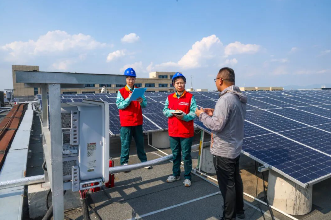 國網(wǎng)濟(jì)南供電公司工作人員在全省首家“光伏+儲(chǔ)能”虛擬電廠—濟(jì)南高新虛擬電廠開展現(xiàn)場(chǎng)服務(wù)