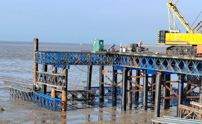 面對潮間帶施工困難的情況,林洋新能源建設團隊將先筑臺、后建站定為首要任務。根據施工規劃,兩座6400平方米的貝雷結構平臺需在1個月內建成,項目組實行設計、施工、監測三班倒機制:技術組白天駐守現場優化鋼管樁打入角度,夜晚核算貝雷架承重數據;施工隊分成打樁、焊接、防腐三個班組交叉作業,在每日兩次潮水退去的間隙搶工。在團隊的齊心協作下,直徑0.63米的鋼管樁群穩穩扎入灘涂,連接平臺與海堤的鋼棧橋同步貫通,為后續近9萬根預制樁、百萬塊組件的運輸安裝奠定基礎。