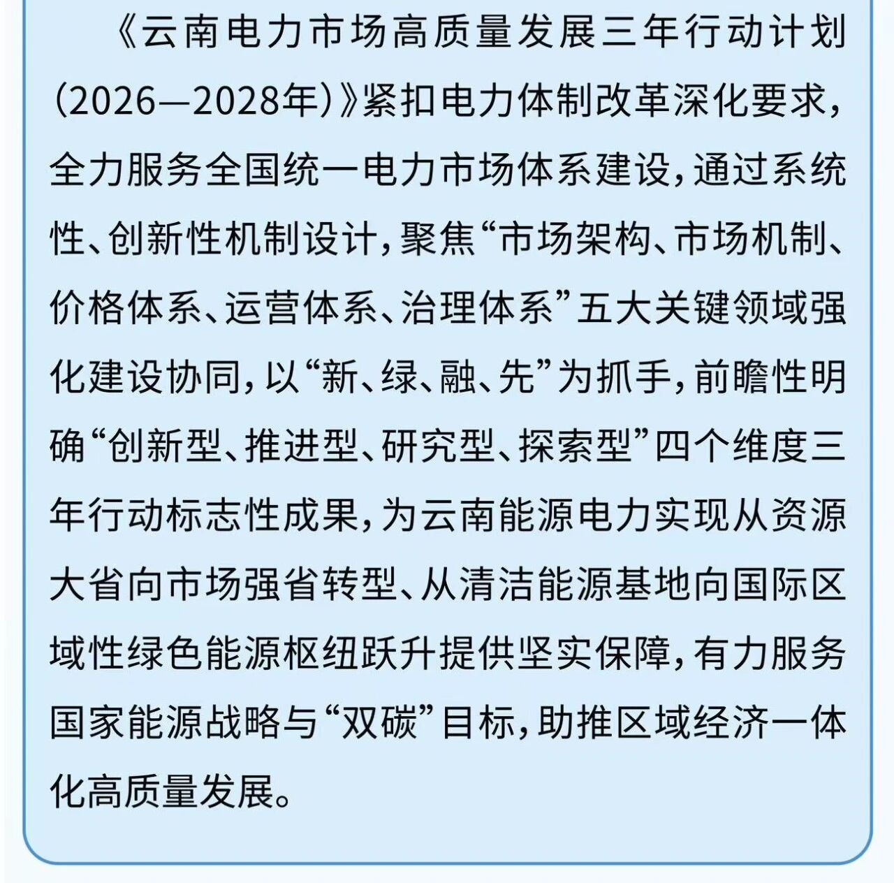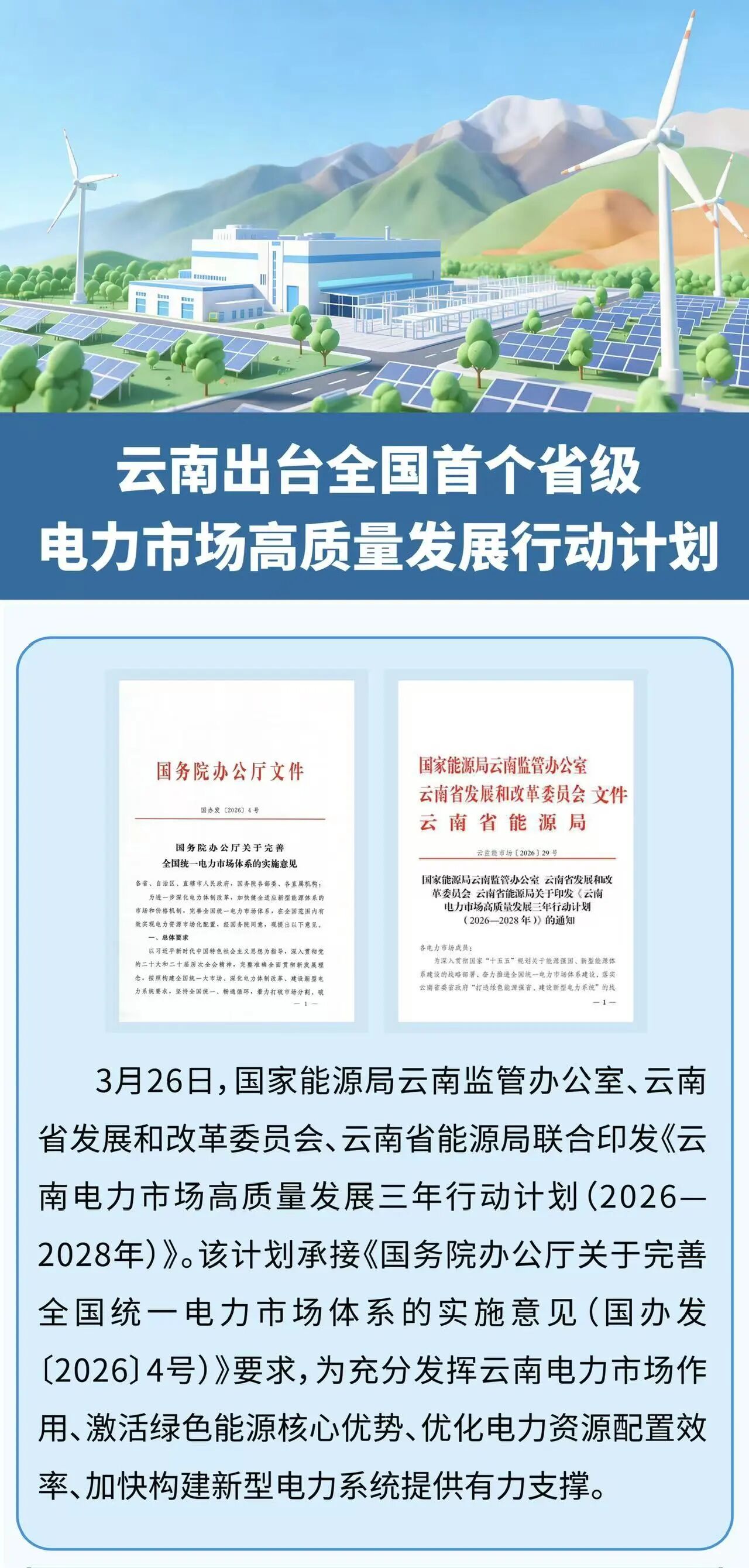 3月26日,國家能源局云南監(jiān)管辦公室、云南省發(fā)展和改革委員會、云南省能源局聯(lián)合印發(fā)《云南電力市場高質(zhì)量發(fā)展三年行動計(jì)劃(2026一2028年)》。