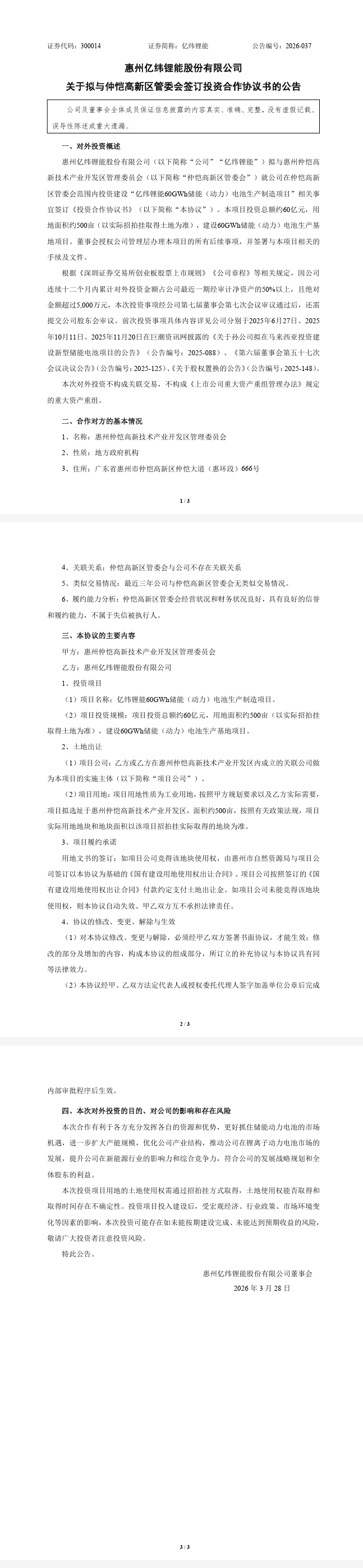 3月27日,億緯鋰能發布公告稱,公司擬與惠州仲愷高新技術產業開發區管理委員會就公司在仲愷高新區管委會范圍內投資建設億緯鋰能60GWh儲能(動力)電池生產制造項目相關事宜簽訂《投資合作協議書》。本項目投資總額約60億元,用地面積約500畝(以實際招拍掛取得土地為準),建設60GWh儲能(動力)電池生產基地項目。...