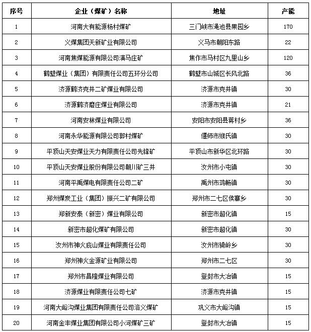 根據《國務院關于煤炭行業化解過剩產能實現脫困發展的意見》(國發〔2016〕7號)、《河南省人民政府關于印發河南省煤炭行業化解過剩產能實現脫困發展總體方案的通知》(豫政〔2016〕59號)和《河南省人民政府辦公廳關于印發河南省化解過剩產能煤礦關閉退出實施方案的通知》(豫政辦〔2016〕154號)精神,按照國家鋼鐵煤炭行業化解過剩產能和脫困發展工作部際聯席會議《關于做好鋼鐵煤炭去產能公示公告工作的通知》要求,現將我省2018年煤炭行業化解過剩產能關閉退出煤礦名單予以公示。