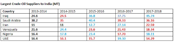 在2016年取消經濟制裁后,伊朗增加了原油產量和出口,超過了委內瑞拉,成為2016 - 2017年印度第三大石油供應國。在2017 - 2018年,伊朗仍然是印度第三大供應國。