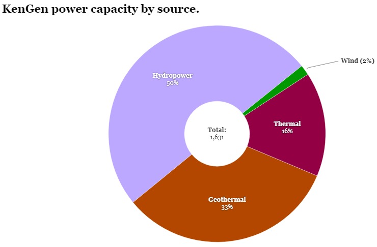 目前,KenGen的總發(fā)電量為1,631兆瓦,其中一半是水力發(fā)電(818兆瓦),地?zé)?534兆瓦),其次是熱能(254兆瓦)和風(fēng)力(25兆瓦)。