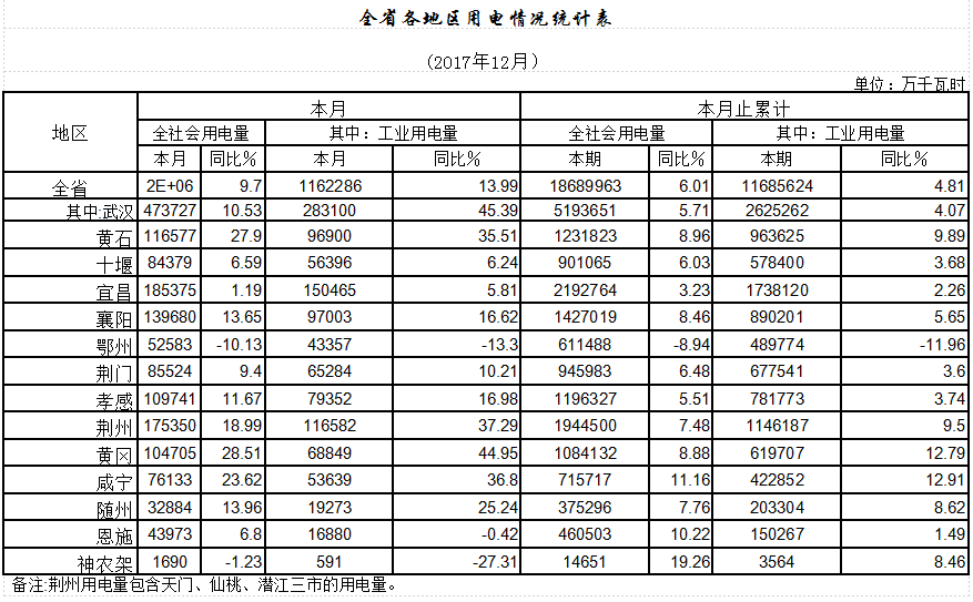 全省14個用電統(tǒng)計地區(qū)中,武漢等13個地區(qū)全社會用電同比增長,其中咸寧、恩施、神農(nóng)架林區(qū)3地全社會用電增幅在兩位數(shù)以上。各地工業(yè)用電基本與全社會用電同步增長,僅鄂州市受鋼鐵行業(yè)淘汰落后產(chǎn)能影響工業(yè)用電下降。“一主兩副”城市武漢、宜昌、襄陽3市全社會用電量占到全省的47.16%,工業(yè)用電量占全省的44.63%,3市全社會和工業(yè)用電均增幅穩(wěn)健,有力促進了全省用電的增長。