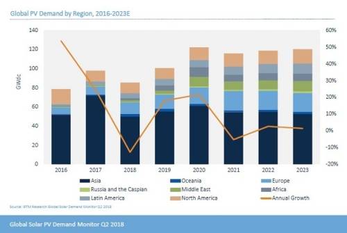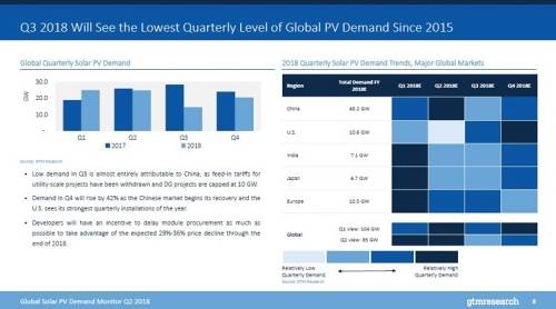 該市場(chǎng)研究公司指出,預(yù)計(jì)2018年中國(guó)光伏需求將從48.2GW的初始年度預(yù)測(cè)下降至28.8GW。據(jù)說(shuō)中國(guó)的突然上限導(dǎo)致了2018年第三季度,創(chuàng)下2015年以來(lái)全球光伏需求的最低季度水平。