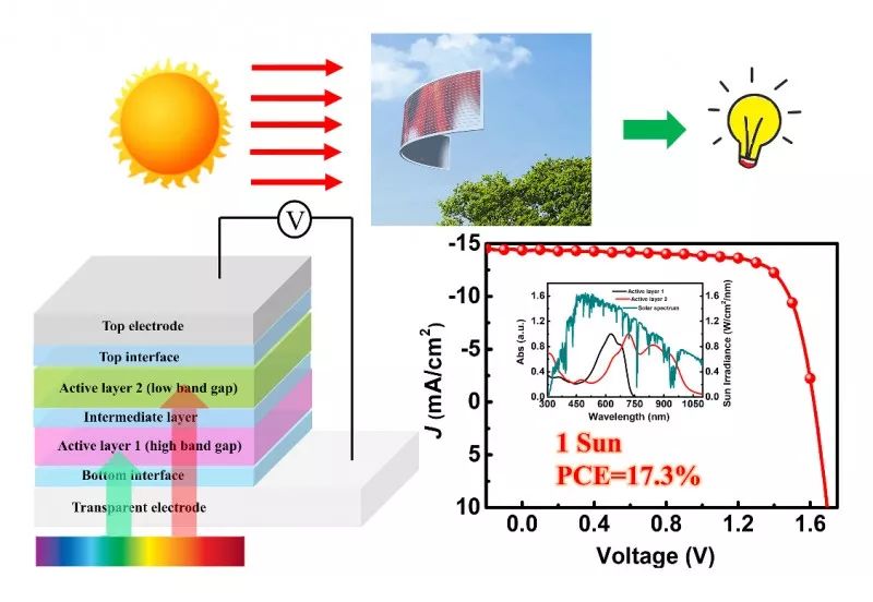 陳永勝教授團隊與中科院國家納米科學中心丁黎明教授、華南理工大學葉軒立教授研究團隊合作,首先利用半經驗模型,從理論上預測了有機太陽能電池實際可以達到的最高效率和理想活性層材料的參數要求。在此基礎上,采用成本低廉與工業化生產兼容的溶液加工方法制備得到了高效的有機太陽能墊層器件,獲得了17.3%的驗證效率。