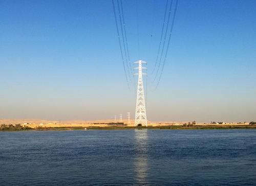 埃及EETC500千伏主干網升級改造輸電工程。圖為輸電線路跨越尼羅河,國家電網公司按照建設“一帶一路”標桿工程開展項目履約。