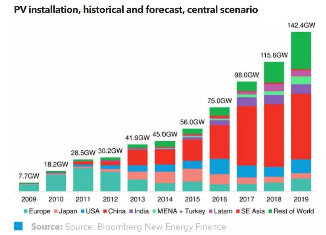 2017年,全球光伏市場再創新高;在2018年“價格走低”和“容量增加”的長期趨勢將會持續。彭博新能源財經近期對全球光伏市場進行了預測,并列出了一些可能阻礙發展速度的因素。