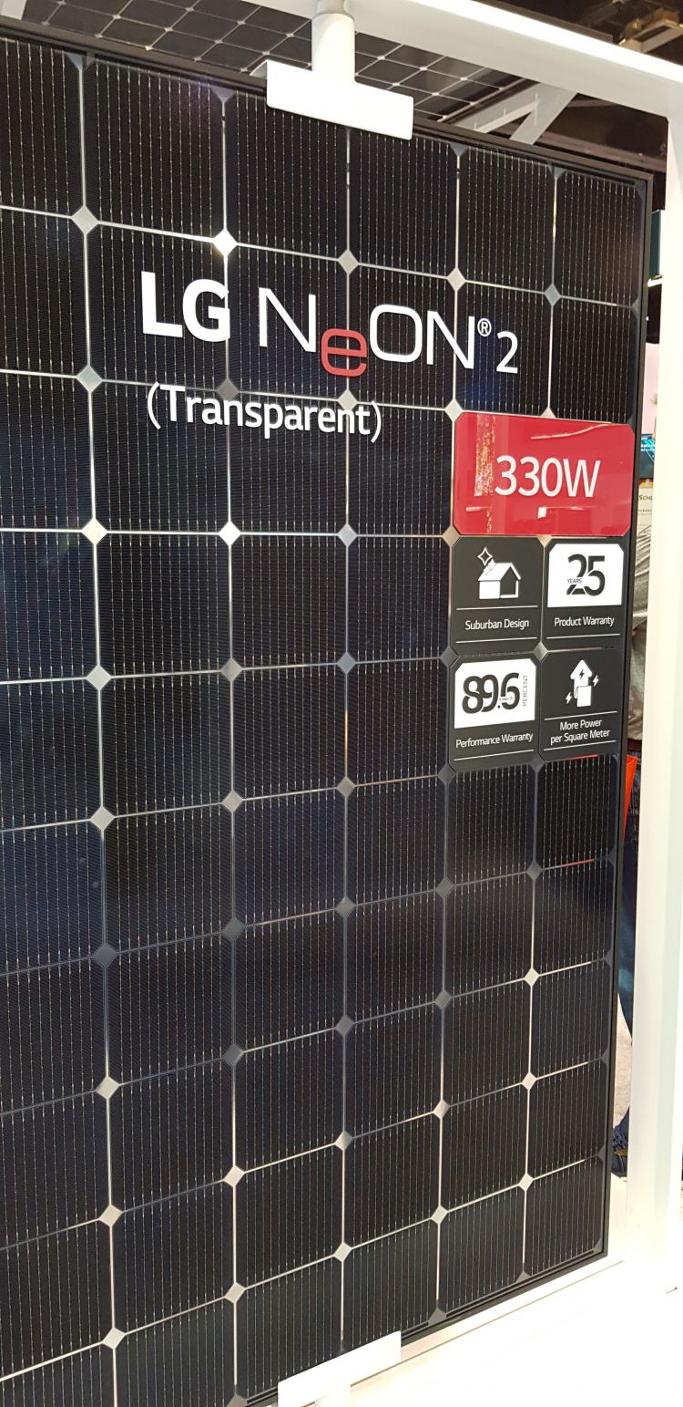LG電子在SPI 2018上展示了其“NeON 2”系列面板,其中包括透明底片??,通過將屋頂顏色與細胞間距混合,改善了住宅系統的美觀。圖片:PV Tech