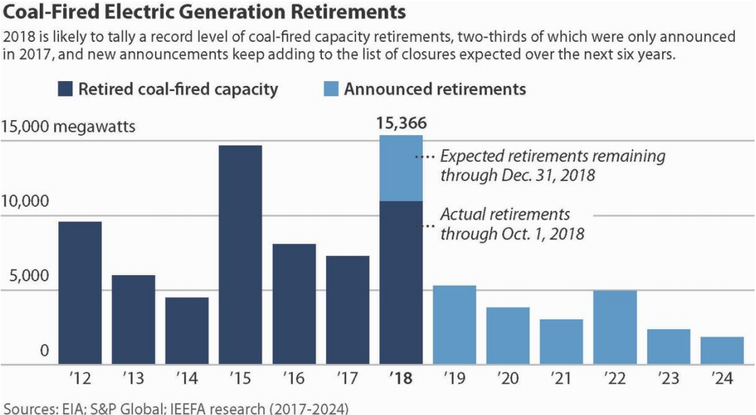 IEEFA預計2018年退休將“輕松”超過目前創(chuàng)下的14.7吉瓦煤炭退休記錄,目前創(chuàng)下2015年的煤炭退役記錄。美國仍有246吉瓦的煤炭在線產(chǎn)能,并宣布到2024年退役占該運營船隊的約15%。