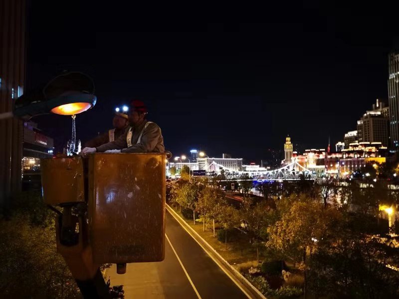 天津電力路燈公司員工在檢修路燈,智慧電網大大減少了路燈故障率