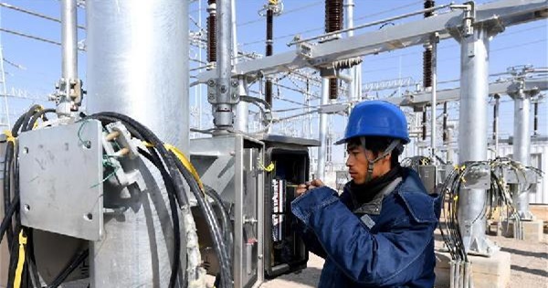 ↑11月6日,國家電網陜西省電力公司的工作人員在陜北風電基地750千伏集中送出工程定靖750千伏變電站進行電纜敷設。