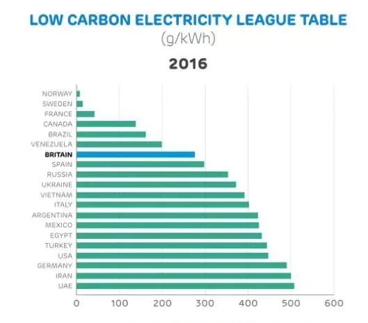 2012年英國發電碳排放強度在33個發達國家中排在第20位,僅僅5年以后英國在這個榜單上的排名升到第7位。在這么短的時間內實現電力系統的低碳轉型,在發達國家中是絕無僅有的成就。