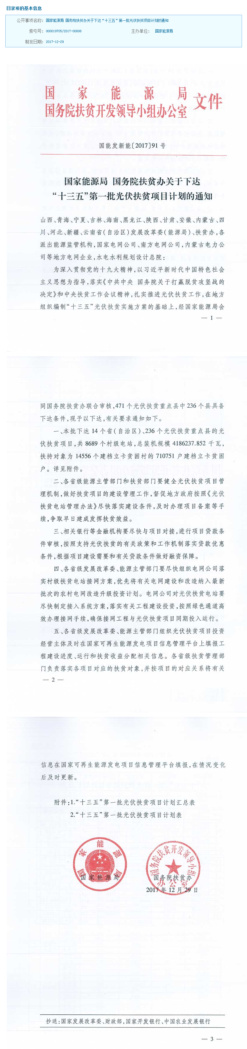 國(guó)家能源局 國(guó)務(wù)院扶貧辦關(guān)于下達(dá)“十三五”第一批光伏扶貧項(xiàng)目計(jì)劃的通知