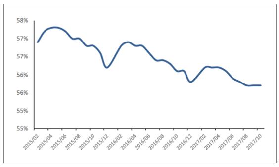 供給體系的質量和效率不斷提升,各類商品價格穩步上揚。2017年6月以來,動力煤價漲幅約10%,而鋼鐵、銅鋁等金屬價格漲幅在20%-30%之間,國內標志性的南華商品指數漲幅超20%。同時,工業企業的成本費用降低,盈利能力增強。1-9月份,規模以上工業企業每百元主營業務收入中的成本費用為92.9元,同比降低0.5元;營業務收入利潤率為6.17%,同比提高0.51個百分點,企業的盈利情況顯著改善。