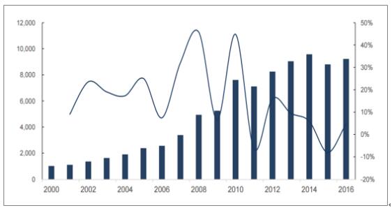 過去五年,我國工業總產值在GDP占比雖然呈現下降趨勢,但仍維持在30%+的比重,顯著高于歐美發達國家。2016年,我國工業總產值占GDP的比重為33.3%,遠超美國(20%左右)。工業在我國經濟結構中的比重至關重要,而恰恰是工業由于環保設施缺乏、技術落后、排放標準不嚴、配套監管缺失等原因,成為了最大的污染源,工業環保任重道遠。