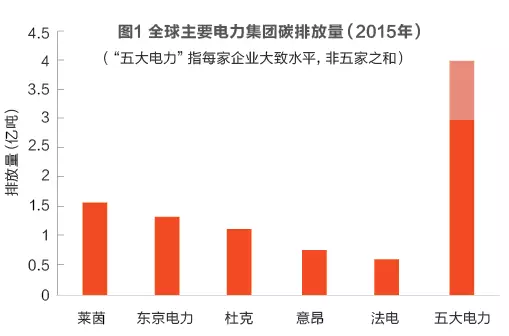 全球主要發電集團,包括法國電力(EDF)、意昂集團(E.ON)、杜克能源(Duke Energy)、萊茵集團(RWE)、東京電力(TEPCO),2015年各自碳排放總量大約在0.5~1.5億噸二氧化碳當量的水平,同期中國的五大發電集團,每一家的碳排放總量均在3~4億噸二氧化碳當量的水平(圖1),遠高于全球主要發電集團的水平,相當于一個中等規模的發達國家的排放量(如英國),在排放量上可謂“富可敵國”。