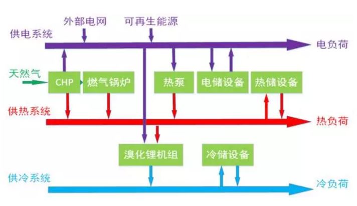 橫向來看依次是源網荷儲。源側包括常規的供電設備、CHP機組、燃氣鍋爐等設備,以及外部電網供電、可再生能源接入;網架分為冷熱電等傳輸系統;荷側為園區內部的電、熱、冷負荷;在儲能方面,不同能源子系統均有各自的儲能設備。縱向來看依次是電、氣、熱、冷多能互補運行。不同的能源子系統分別用不同的顏色表示,多種能源轉化設備(熱泵、CHP、燃氣鍋爐、溴化鋰機組)將不同的能源子系統相耦合。園區內部多種能源形式以虛擬電廠的形式組合在一起綜合運行,在保證電、熱、冷負荷可靠供應的前提下,實現了能源的梯級利用,提高能效,降低用能成本。并且對于波動性很強的可再生能源而言,綜合能源系統具有更多的靈活性,促進了可再生能源的接納,進一步提高系統經濟性。