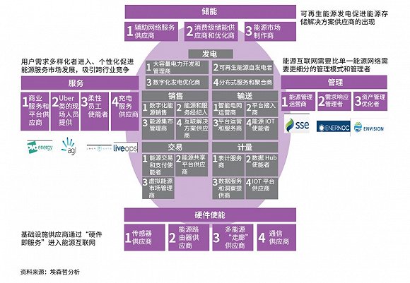 除了傳統的電力發、輸、配、售、調度外,能源互聯網中還出現了六類新玩家:交易、表記數據應用、能源服務、能源管理、能源存儲、使能技術。即使是傳統價值鏈中的角色,也細分出了數字化發電優化供應商、分布式能源服務商和能源聚合商等新角色。