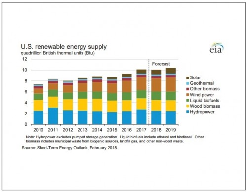 美國(guó)能源信息署(EIA)發(fā)布了其短期能源展望2月版,預(yù)測(cè)2018年和2019年非水電可再生能源將提供全美發(fā)電量的大約10%。