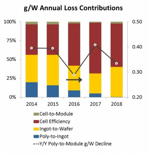 主要有兩種因素促成了多晶硅g/ W消耗量的下跌:金剛線切割和電池效率的提高(更多的使用單晶,尤其是PERC技術(shù))。到2018年年底,幾乎所有的硅片生產(chǎn)(單晶和多晶)都會使用金剛線,幾乎所有的單晶產(chǎn)品都會使用PERC技術(shù),而多晶產(chǎn)品將會經(jīng)歷自身PERC技術(shù)升級的階段。這些變化令其他階段發(fā)生的漸進式改進(鑄錠/拉錠、電池-組件損失和硅片厚度減少)相形見絀。