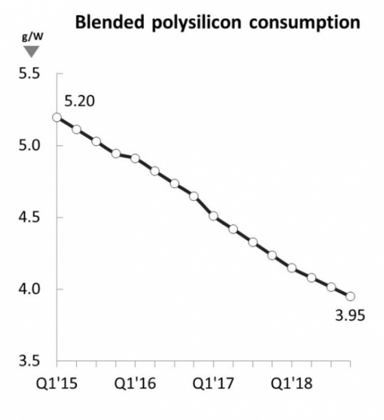 預(yù)計多晶硅消耗量在15年1季度和18年4季度之間下降了25%,在2018年結(jié)束時混合水平下降到3.9g/W。