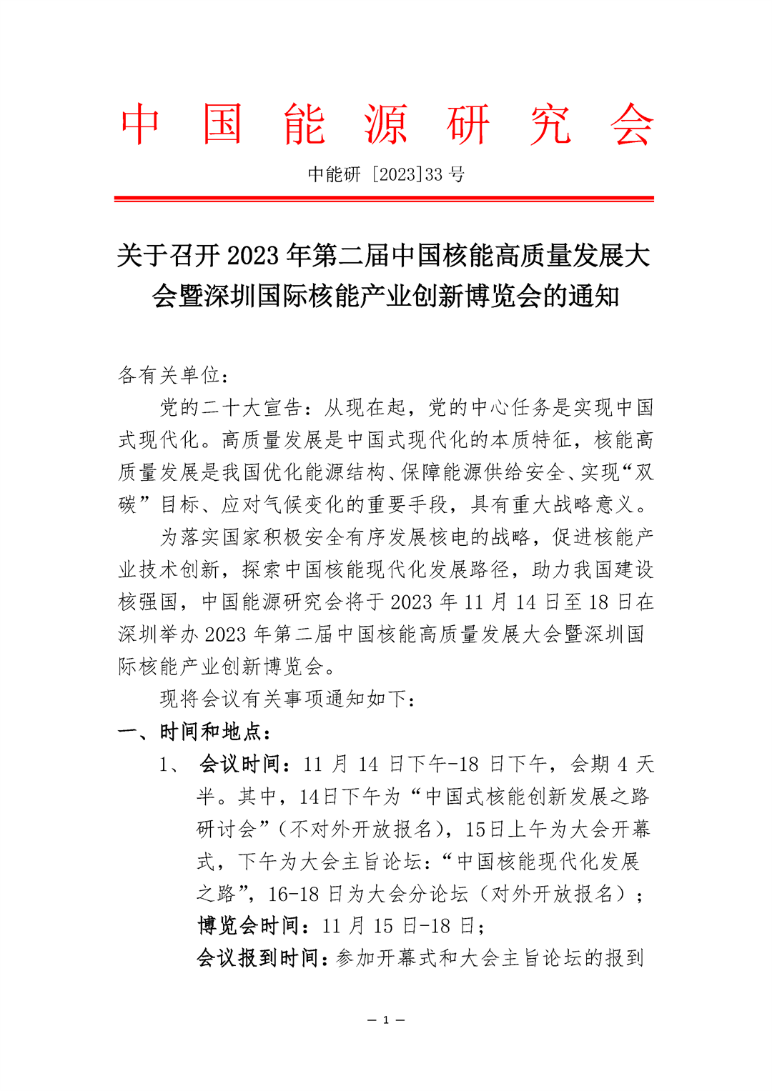 關(guān)于召開2023年第二屆中國核能高質(zhì)量發(fā)展大會暨深圳國際核能產(chǎn)業(yè)創(chuàng)新博覽會的通知