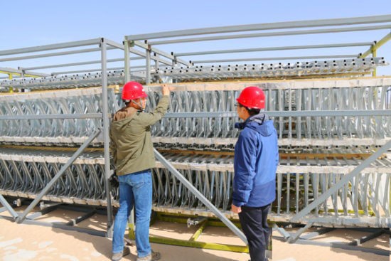 圖:甘肅光熱發(fā)電有限公司工程技術(shù)人員正在檢查剛剛到貨的集熱支架