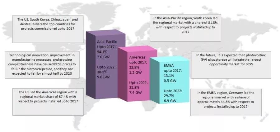 這前五個國家在2017年的累計裝機總量占全球80%以上。在2017年亞太地區以54.1%的市場份額引領全球市場,其次則是占據32.8%的美洲,接下來是歐洲、中東,以及非洲。非洲到2017年為止裝機量占據13.1%。依賴于科技發展,鋰離子電池已經成為目前的首選,到2017為止鋰離子電池在全球電池儲能系統裝機總量份額大約超75%。據推測鋰離子電池將會是整個研究期間的關鍵技術。